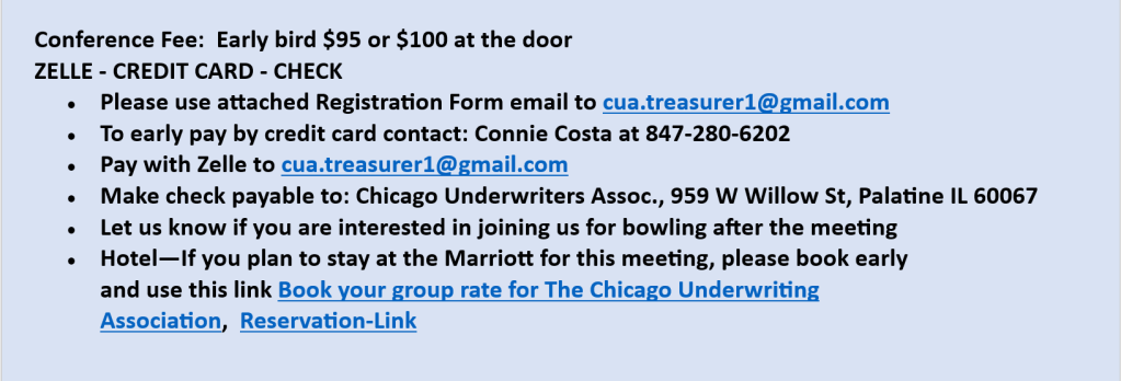 - Hotel—If you plan to stay at the Marriott for this meeting, please book early and use this link Book your group rate for The Chicago Underwriting Association, Reservation-Link